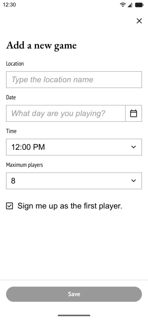 Adding a new game is a simple validated form that slides up from the bottom of the screen. The “Save” button becomes active when the user fills in all the needed details. I thought it would be a nice add-on to allow the user to add themselves as the first player in the group. After tapping “Save” the user goes back to the home screen with a new card on the list.