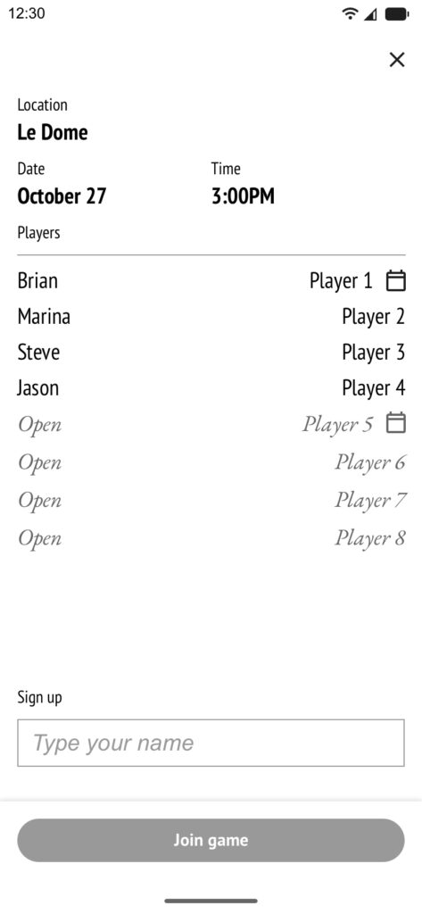 Tapping one of the existing games on the home screen slides the “join” screen from the right. Existing players and open spots are shown. Typing a new name in the “Sign up” box instantly adds that player’s name on this screen – allowing for spouses, partners, etc. to sign up multiple people at the same time.